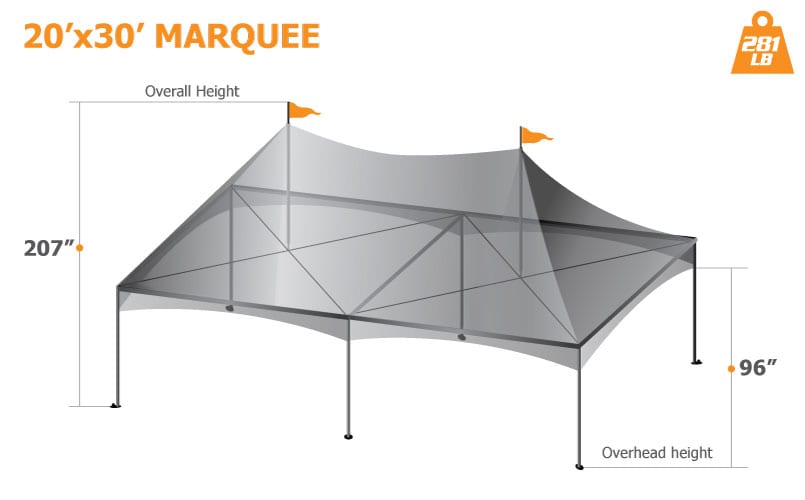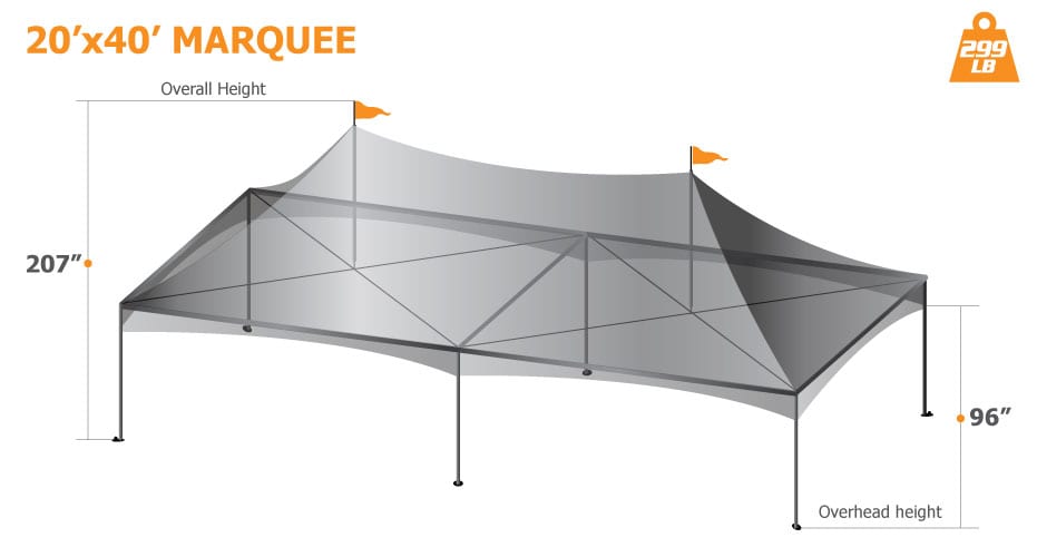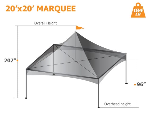The Marquee is part of our custom frame tent collection that is super strong and easy to setup without the need of any tools. This very popular canopy frame is ideal for many events ranging from sporting to festivals and even private parties. The convenient sized poles make it is very easy to setup requiring only 15 minutes to set up a 20’x20’ and 20 minutes for a 20’x40’.