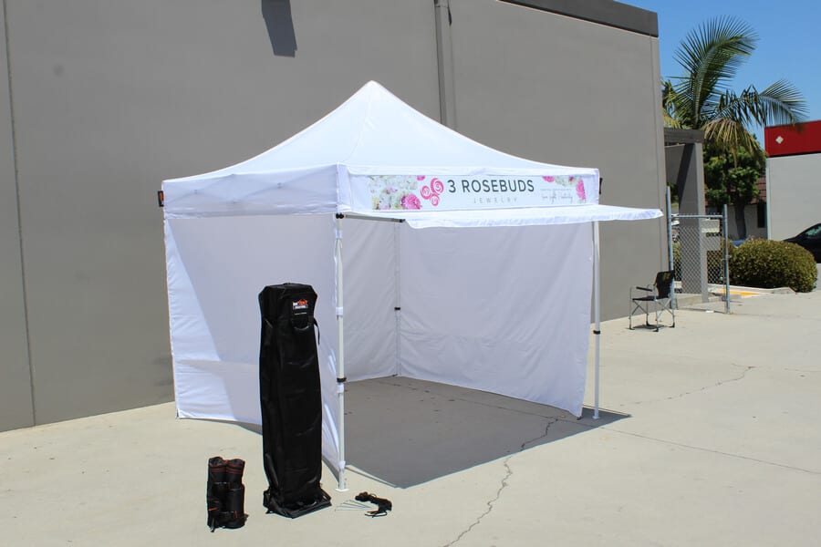 The InsTenT Vendor Kit is an ideal portable shop for your art & craft fairs, food festivals, farmers market and more! It is the only canopy in the market to offer a banner sleeve located on the front valance to give you the option to insert your own custom branded banner* and set your business apart from the competition. Additionally, it comes with a 10′ adjustable awning to add extra shade and protection to your vendor booth and a full wall set (3 walls and 1 wall with zipper door). A roller bag and a stake kit are included.