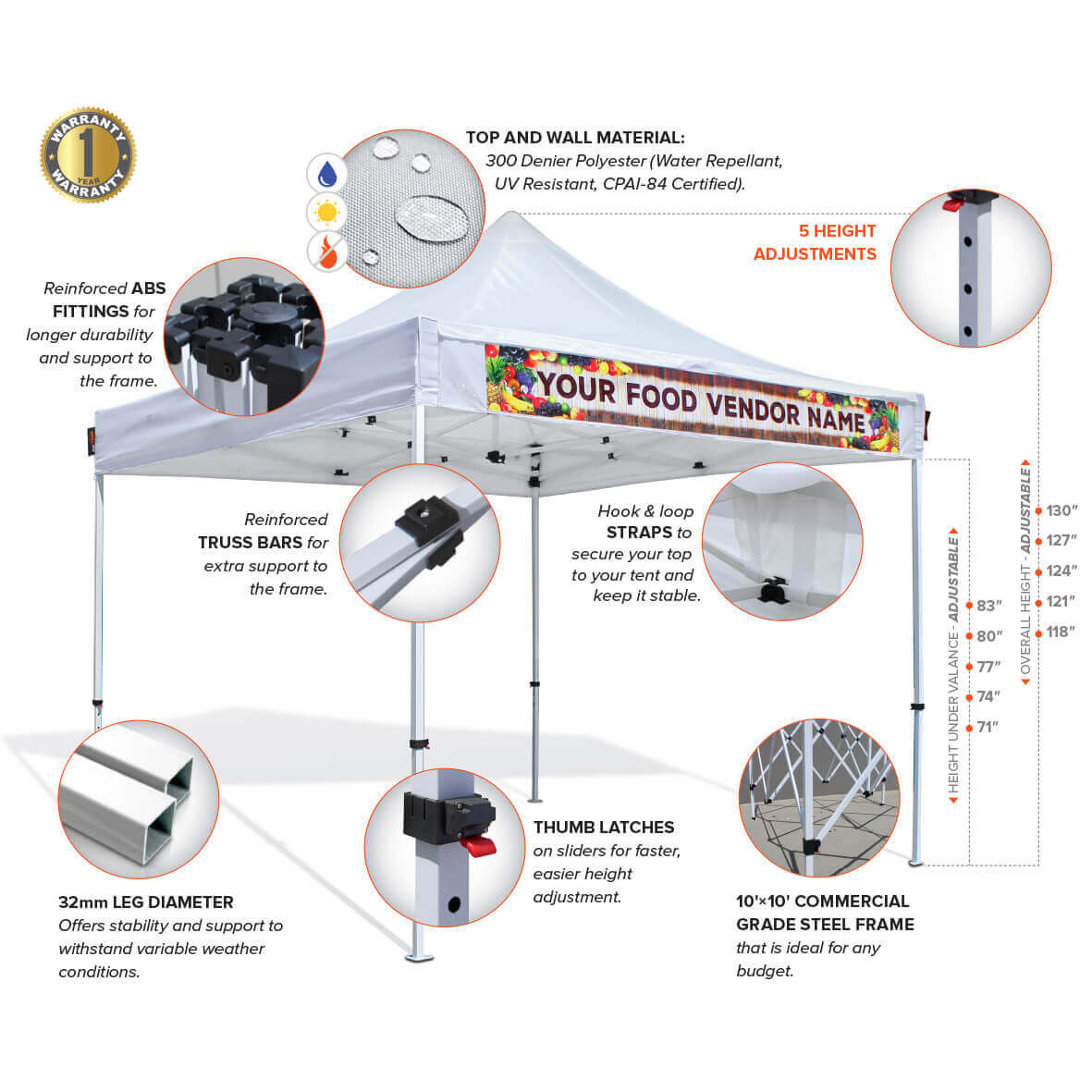 – 10×10 commercial steel frame with powder coated finishing for rust-free protection and 32 mm diameter legs for optimal stability