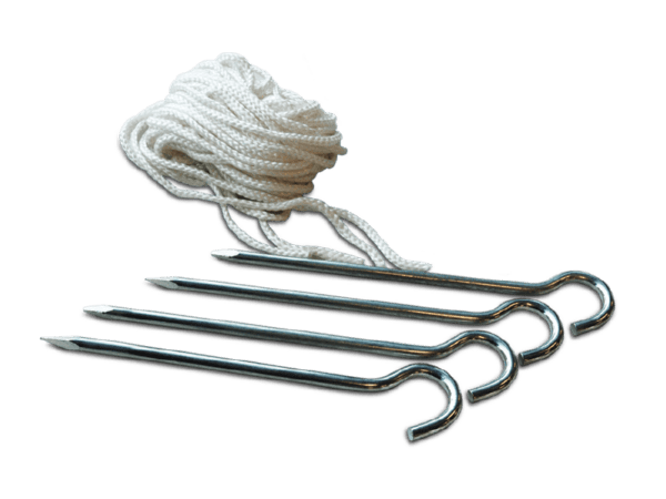Includes 4 stakes, 4 ropes and a storage bag. It will hold and secure the tent in case of light wind.