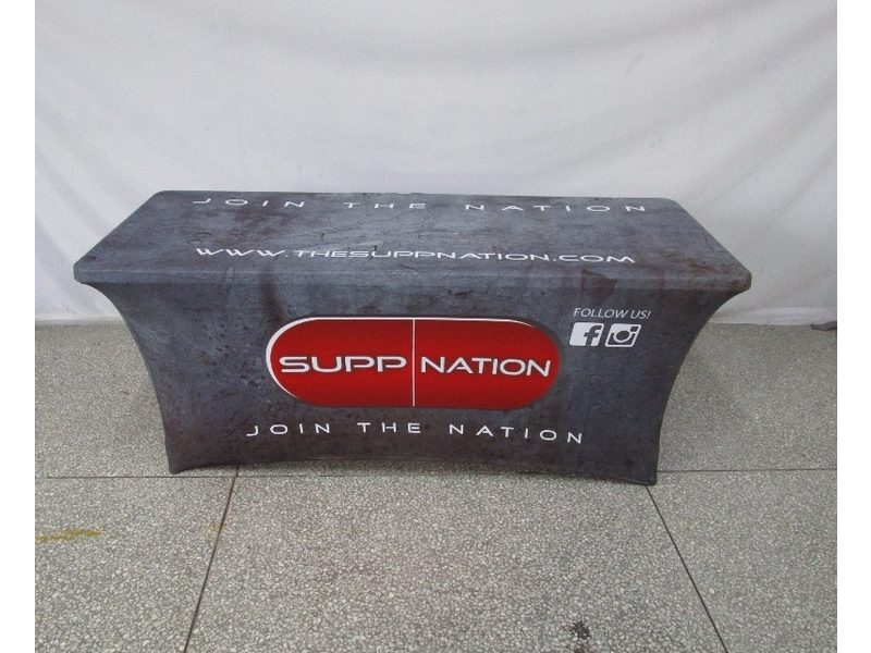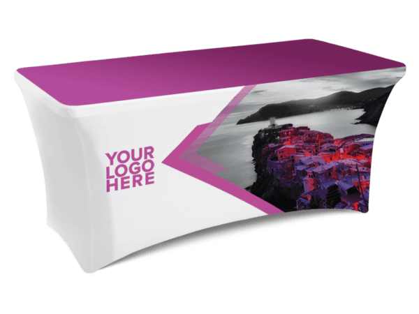 This custom stretch table cover is part of our line of table covers that gives a professional and a classy finishing to any booth. This sleek and modern table cover is ideal for trade shows, sporting competitions, promotional events, school events, fundraisers table and many more.